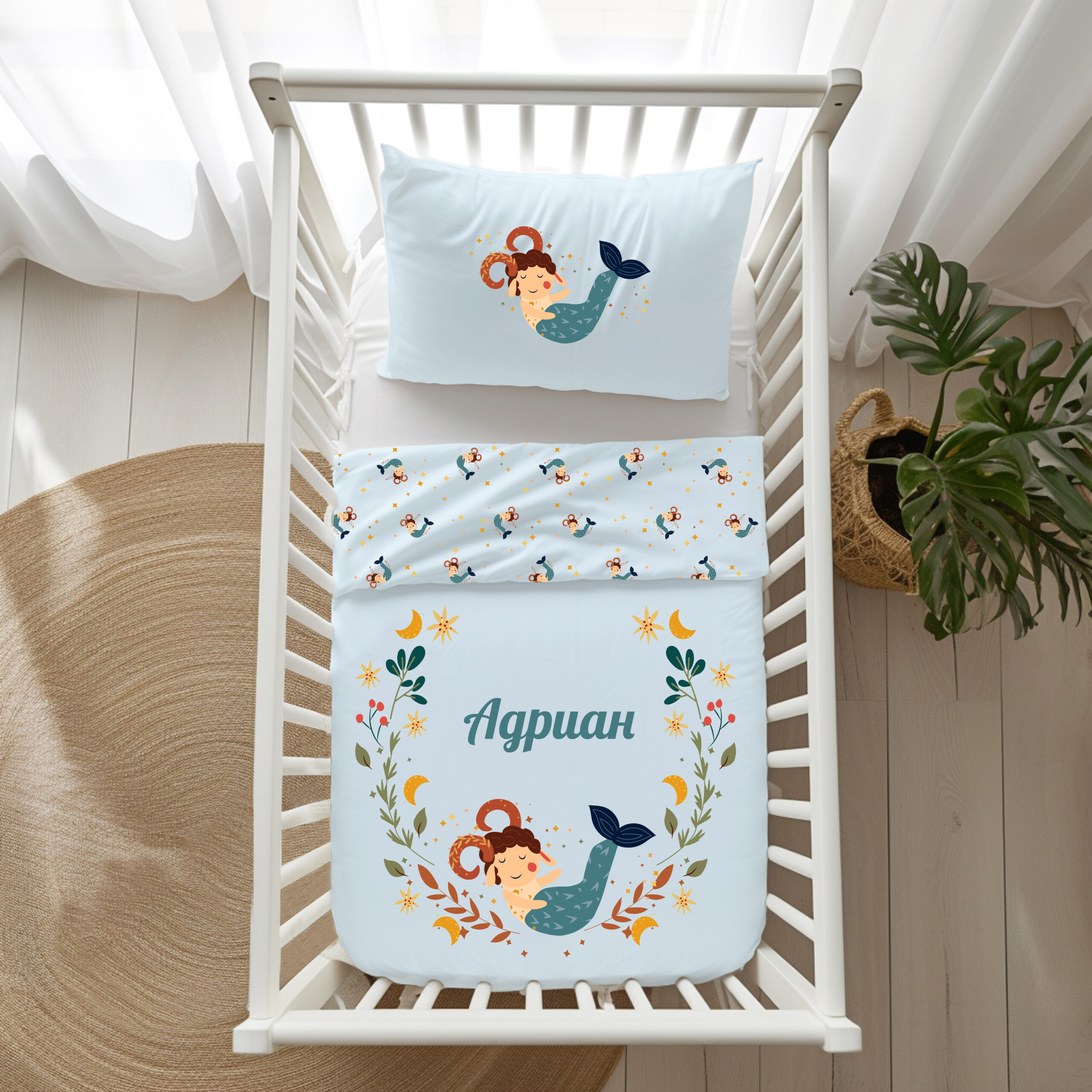 Персонализирани бебешки чаршафи от 100% органичен памук със зодия КОЗИРОГ